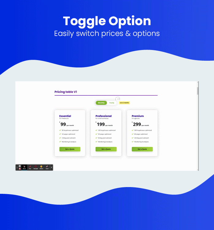 Each pricing table has a toggle option, but you can disable it if you do not need it. When you use the toggle in the demo, the price will change but you can change any element of the pricing table.