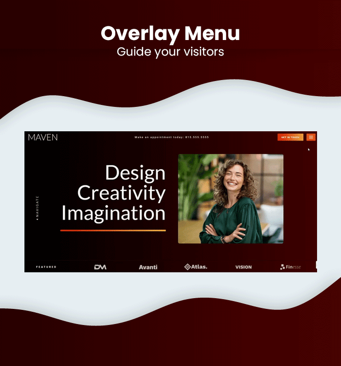 The Fullscreen Overlay Menu is a unique and modern feature that allows users to easily navigate through the different pages of the website. With just one click, the menu slides in from the top and reveals all the page options available. This adds a touch of sophistication and ease to your website’s navigation.