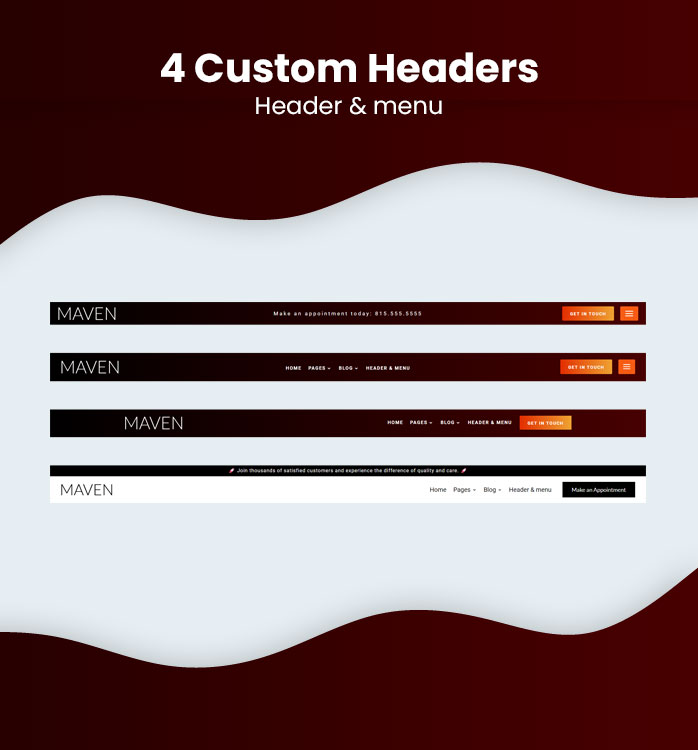 Maven offers three different headers and menus that you can switch around to customize the look of your website.