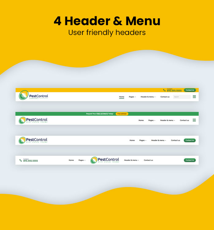 With Pest Control you will get 4 designed headers & menus that you can easily swap out.