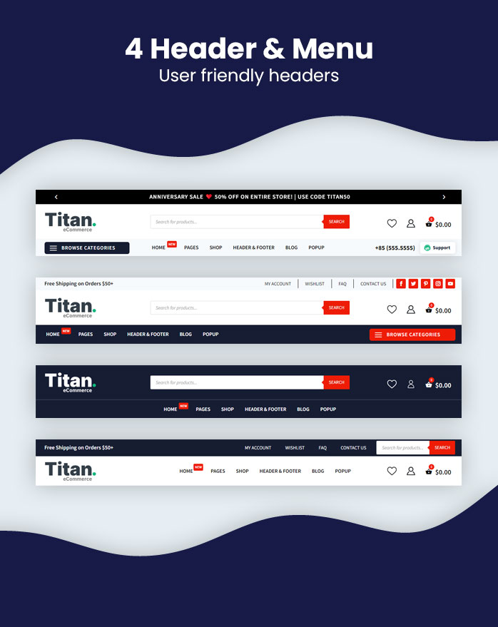 With Titan, you will get 4 designed headers & menus that you can easily swap out.