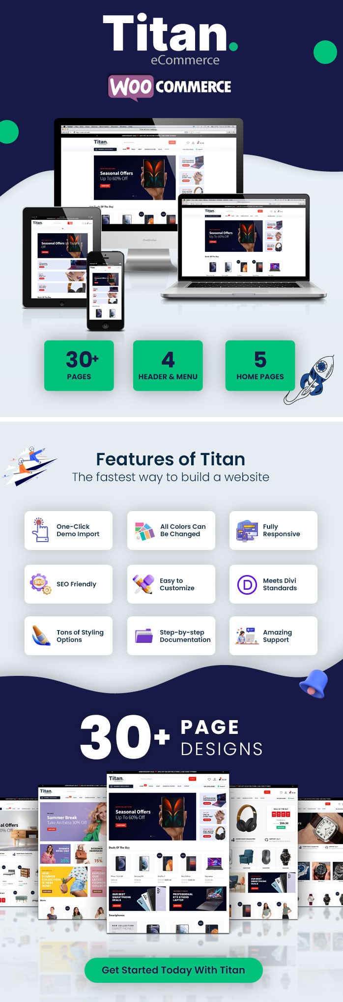 Titan is an eCommerce Divi child theme for shops. Perfect website for any type of WooCommerce shop with Divi. This is a fully customizable Divi template designed to get your website up and running in no time.