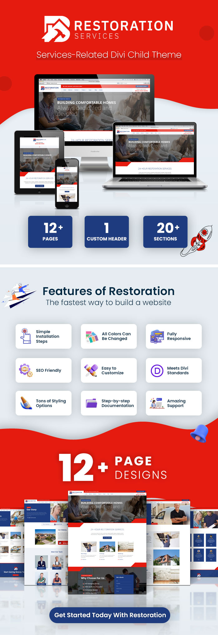 Restoration is a Divi child theme for the home service niche. Perfect website for contractors, renovators, and roofing companies. This is a fully customizable Divi template designed to get your website up and running in no time.