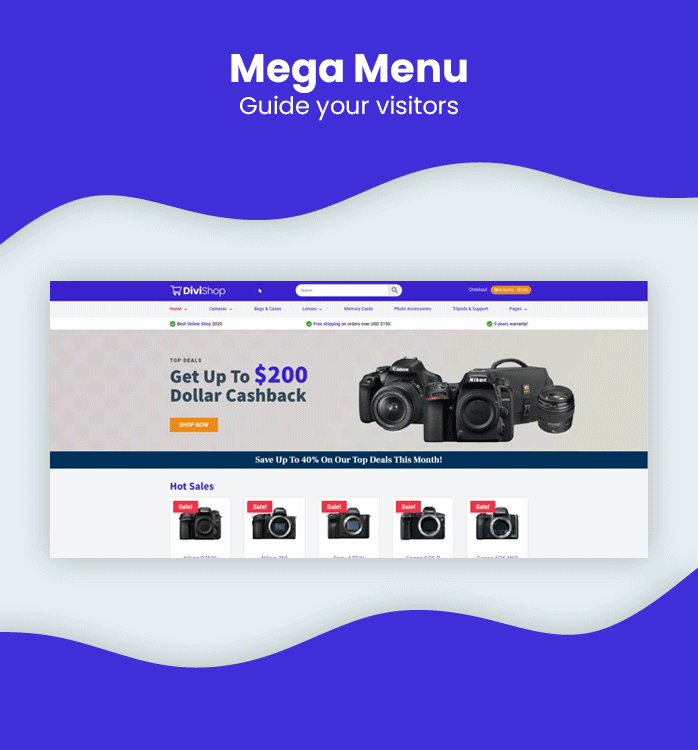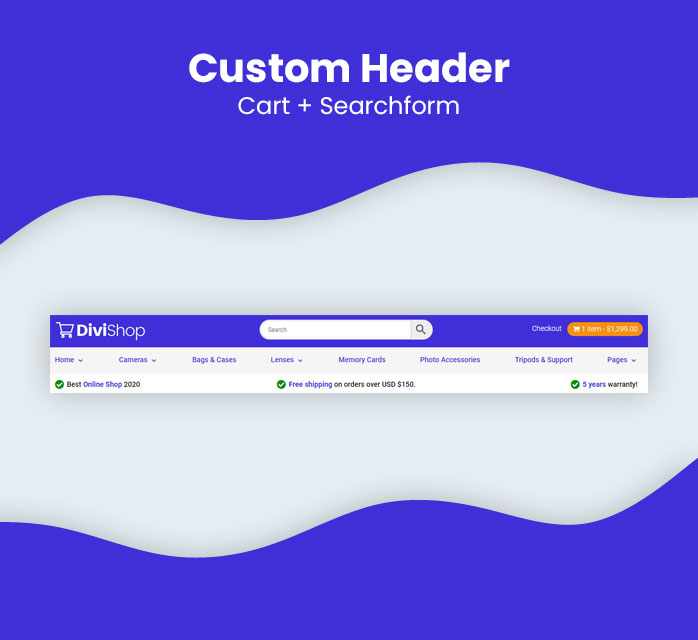 DiviShop comes with a custom-designed header & menu. You can adjust any color of this header and place additional modules in it.