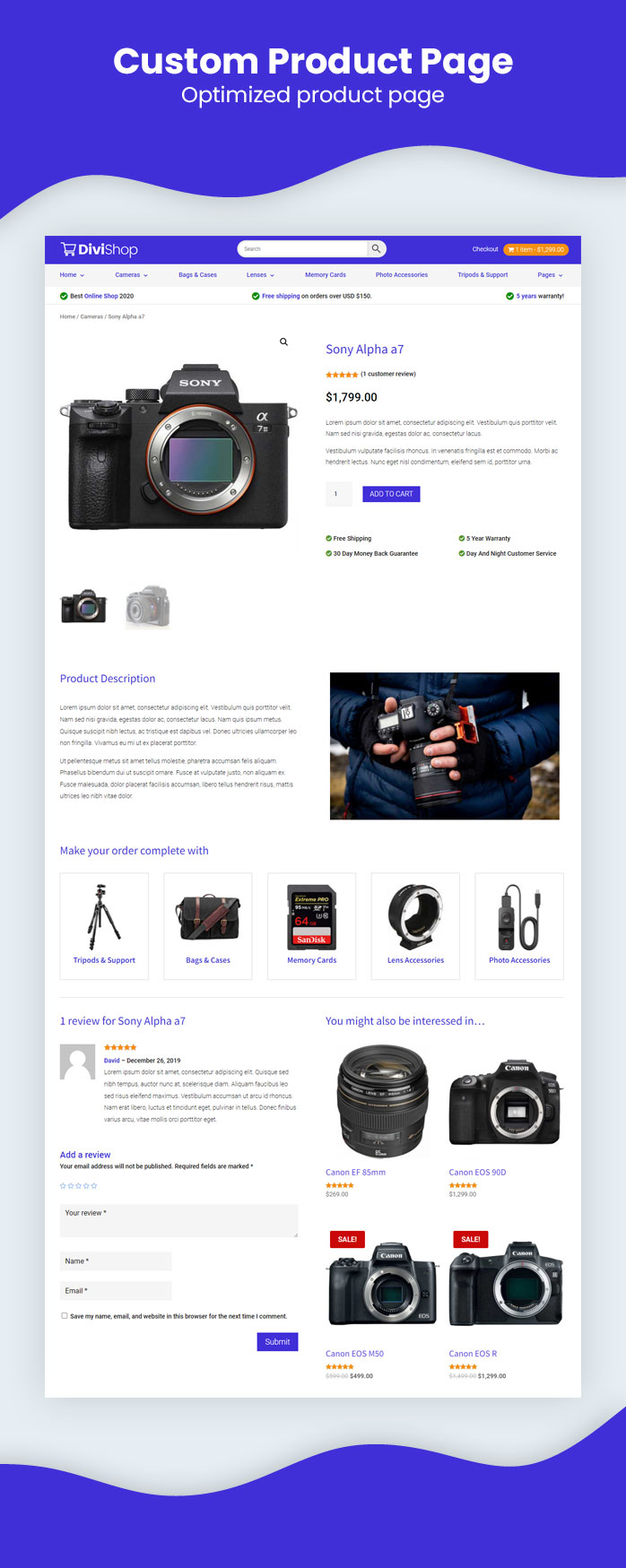 DiviShop comes with a custom-designed product page. You can place any Divi module on this page.