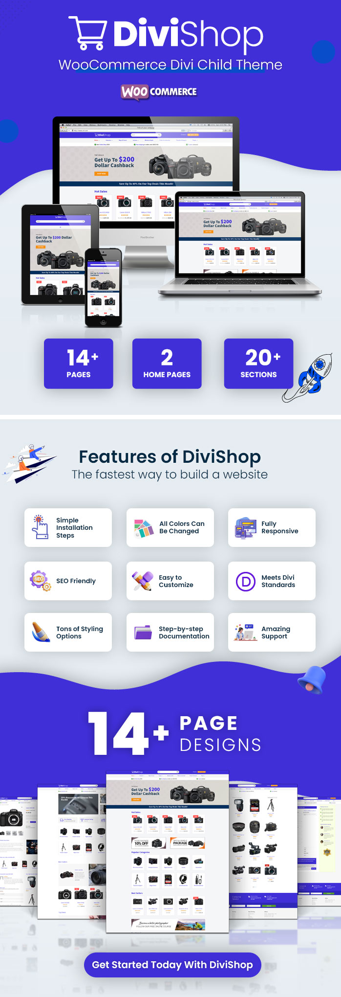 DiviShop is an eCommerce Divi child theme for shops. Perfect website for any type of WooCommerce shop with Divi. This is a fully customizable Divi template designed to get your website up and running in no time.