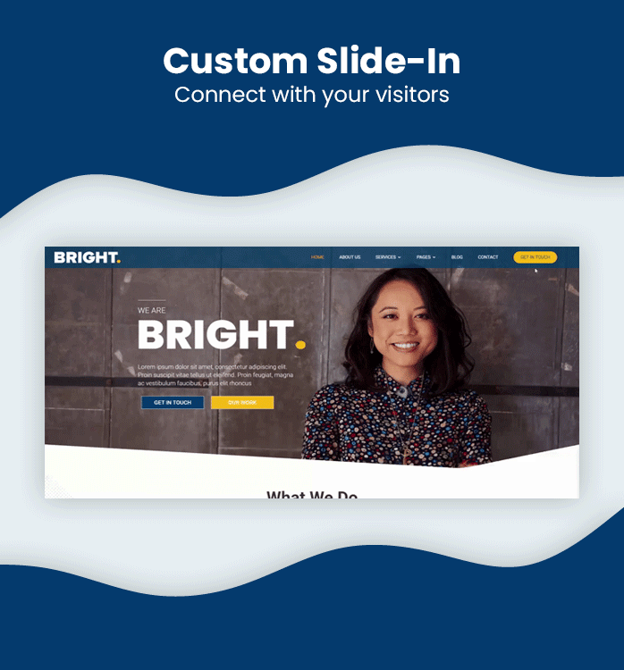Bright comes with a built-in slide-in option. You can add any Divi module in this slide-in. To trigger the slide-in you can use any button or link for it.