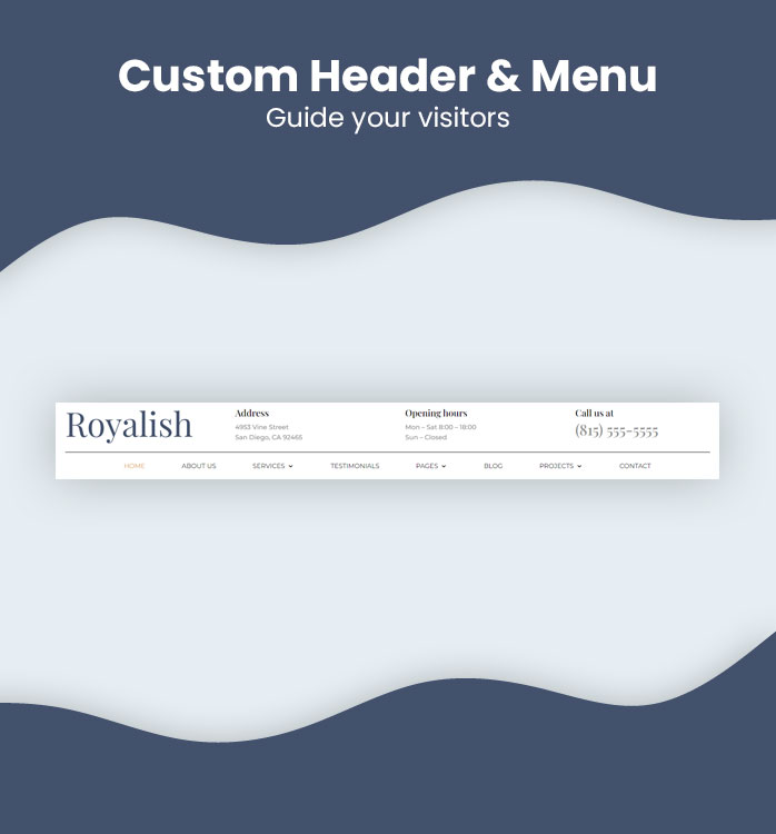 Royalish comes with a custom-designed header & menu. You can adjust any color of this header and place additional modules in it.