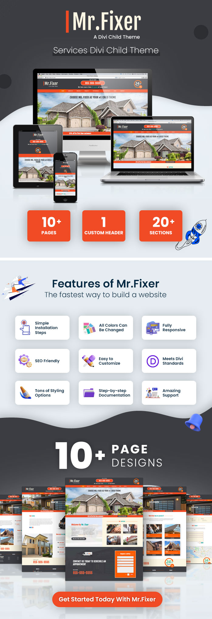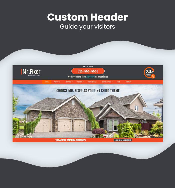 Mr. Fixer comes with a custom-designed header & menu. You can adjust any color of this header and place additional modules in it.