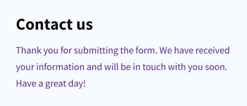 “Thank you for submitting the form. We have received your information and will be in touch with you soon. Have a great day!”