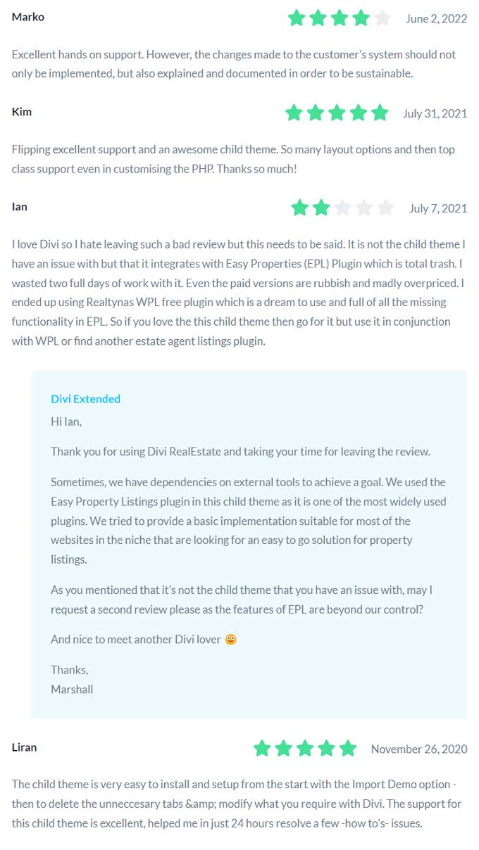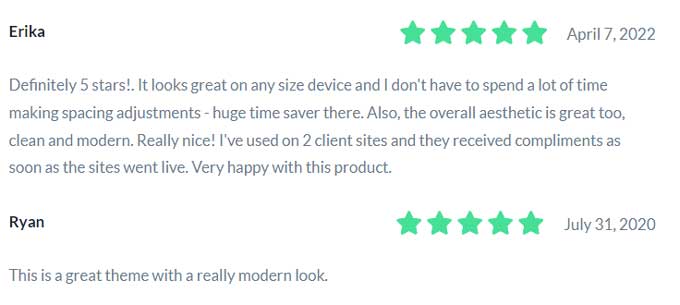 Molti has tons of 5-star reviews on the Elegant Themes marketplace. Here is a picture of some of these reviews.