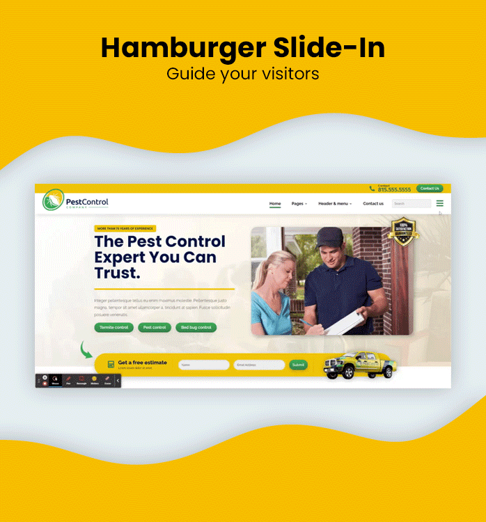 Pest Control comes with a hamburger slide-in that you can trigger by clicking on the hamburger icon in the menu. You can place any Divi module inside this slide-in. This is a great way to attract your visitors to contact you or to guide them through your website.