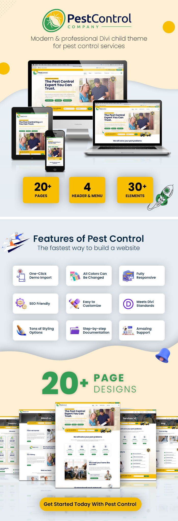 Pest Control is a modern & professional Divi child theme for pest control services and comes with 20+ pages and 30+ elements.
