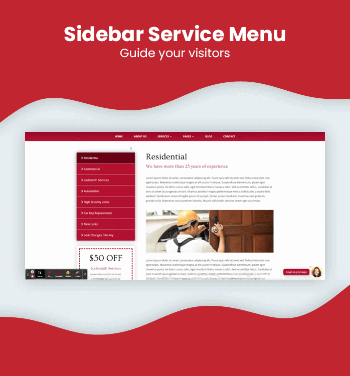 Your customers can easily navigate between your service pages with this custom-made side menu.