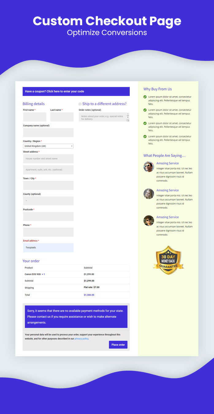 Stop losing sales on the default checkout page. DiviShop comes with a custom-optimized checkout page that will gain the trust of your customers.