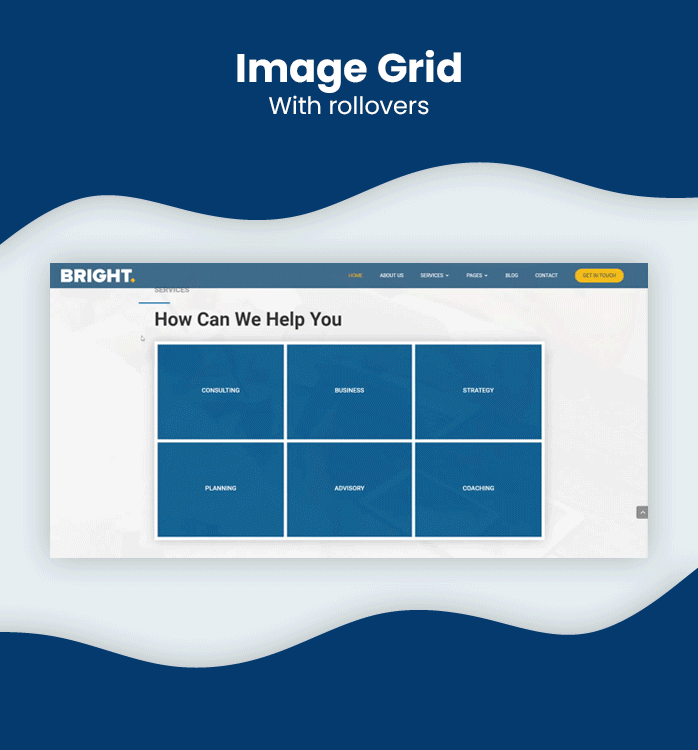 On the home page, you find a beautifully designed image grid. When you hover over a column/service the background image will change, this will give a great effect on your services.