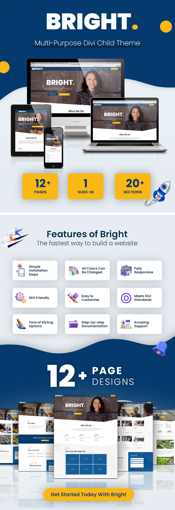 Bright is a multi-purpose business Divi child theme for modern brands. Perfect website for agencies, consultants, web designers, and marketers. This is a fully customizable Divi template designed to get your website up and running in no time.