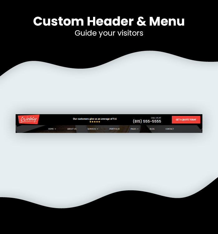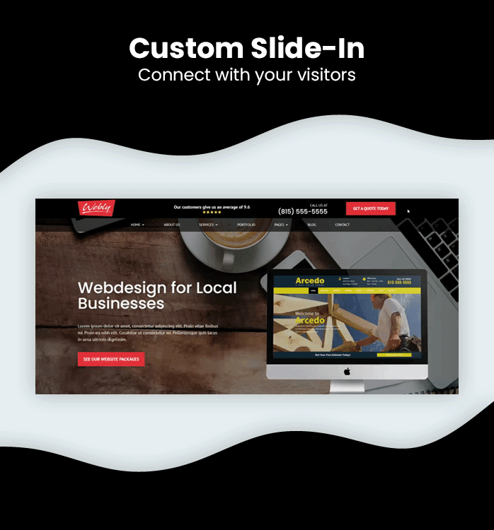 Webly comes with a custom slide-in which you can trigger by clicking on the Get a Quote Today button in the menu. You can place any Divi module inside this slide-in. This is a great way to attract your visitors to contact you or to guide them through your website.