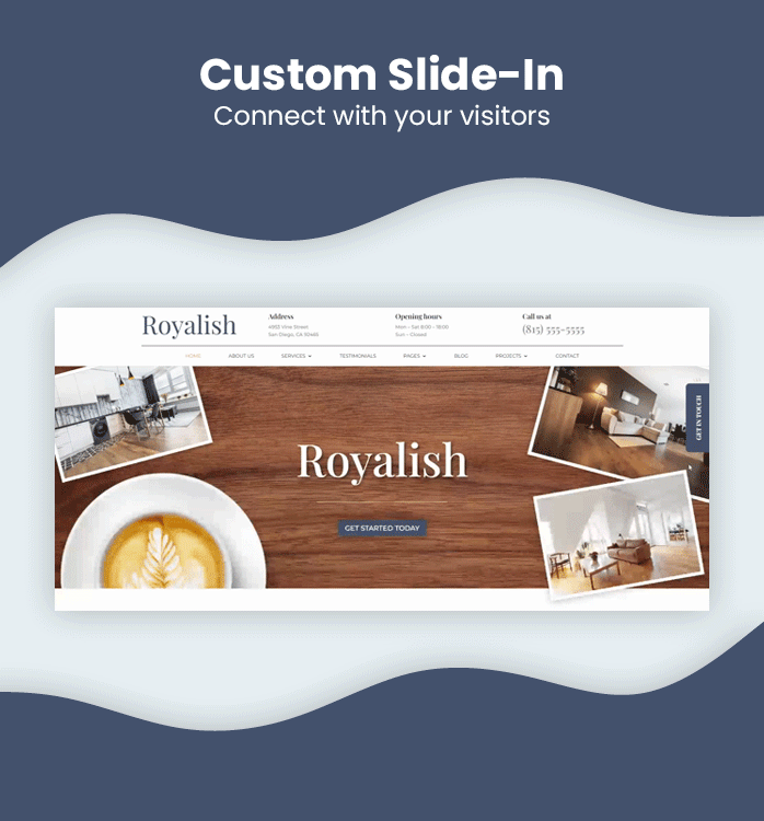 With Royalish you get a built-in slide-in option. When you click on the label on the right side a slide-in will appear with a contact form.