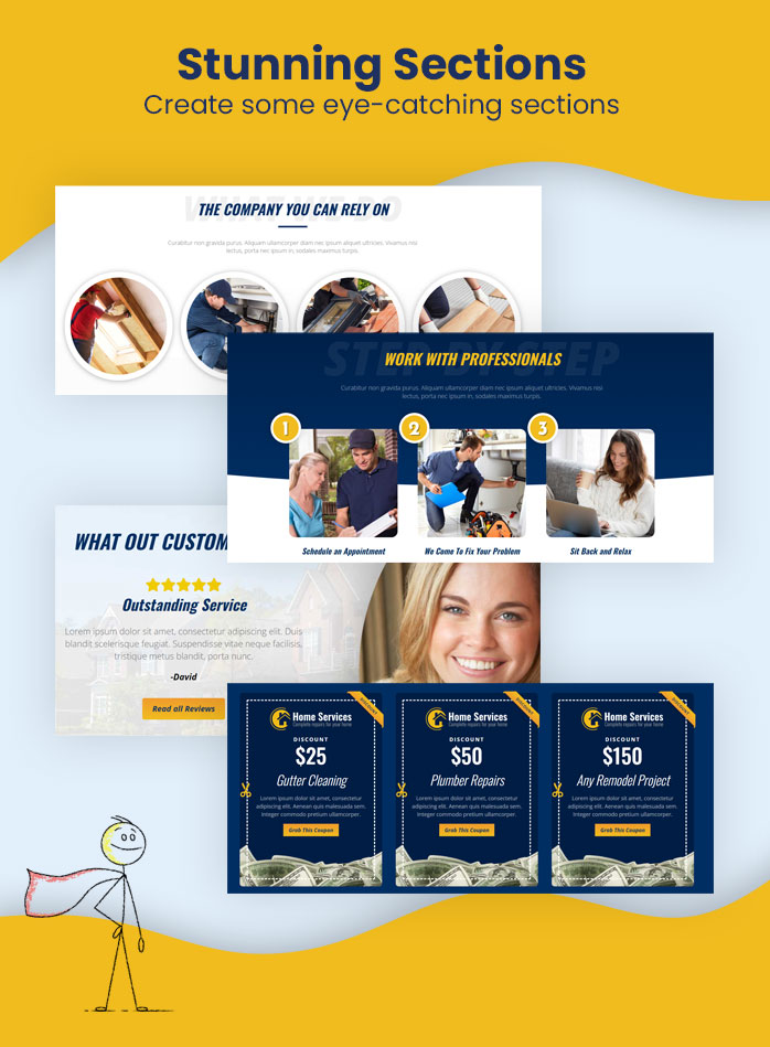 With Home Services, you get tons of premade section layouts that you can further customize for your needs. You can save any section into the Divi Library and place them in any place on your website.